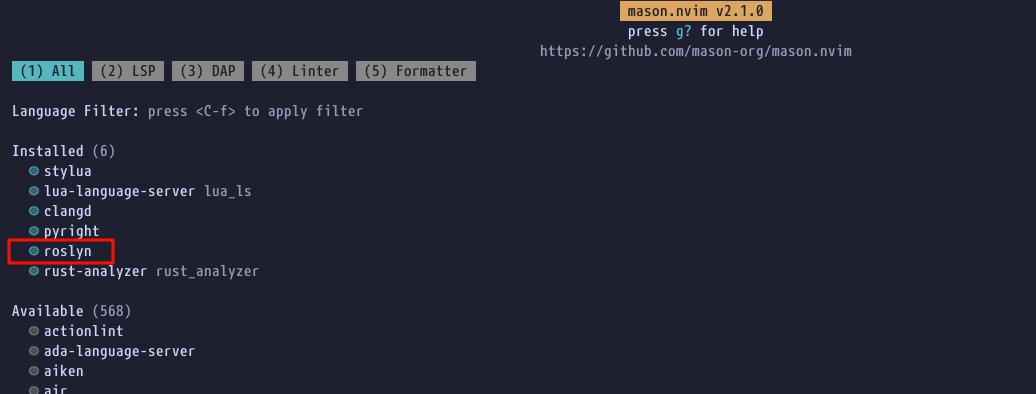After that, you can open the Mason menu with :Mason and install Roslyn.